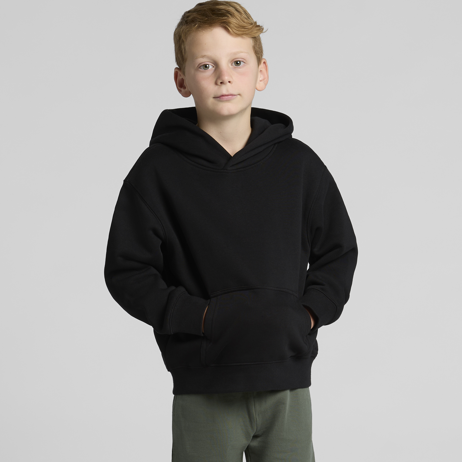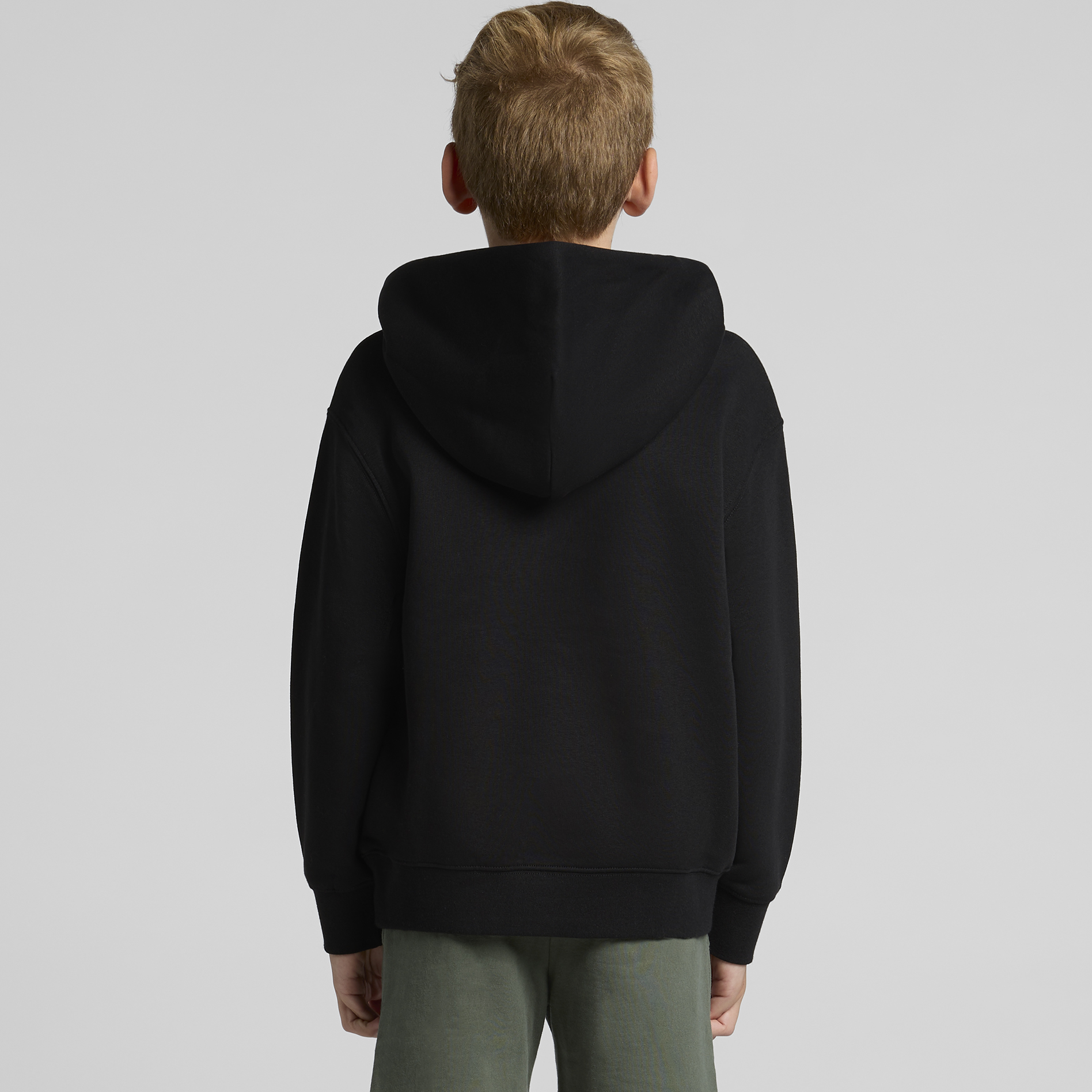 Pre-shrunk to minimise shrinkage, pullover hood, drop shoulder, cropped full length, self-fabric lined hood, no drawcord, sleeve cuff ribbing